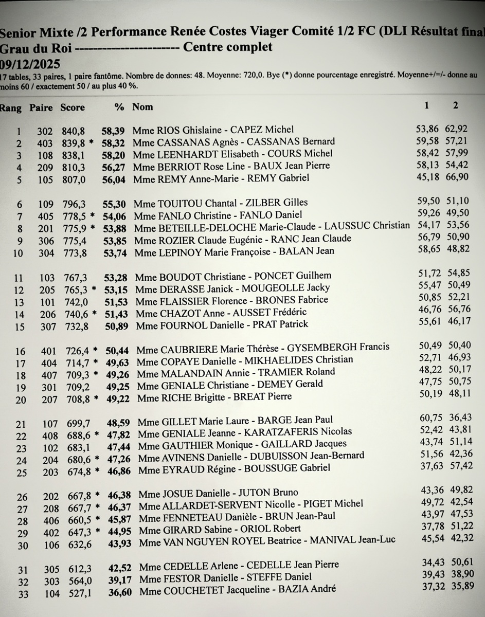 Le mardi 9 décembre le BCGR accueillait le tournoi Seniors Mixte Performance par paires.