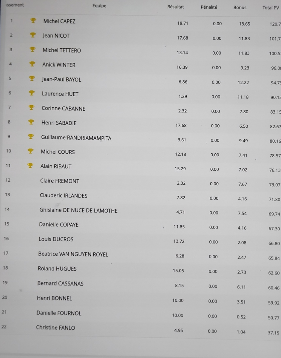 Toutes nos félicitations à l’équipe Michel CAPEZ, Ghislaine RIOS, Henri GROS et Philippe GRAND qui se sont classés à la 1ère place.
